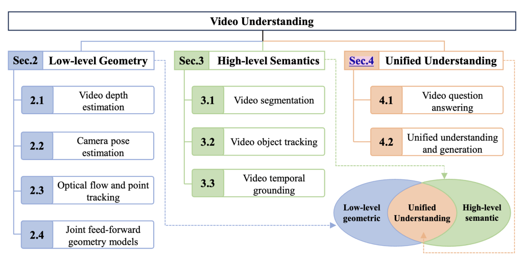 ![]() | Video Understanding: From Geometry and Semantics to Unified Models Zhaochong An, Zirui Li, Mingqiao Ye, Feng Qiao, Jiaang Li, Zongwei Wu, Vishal Thengane, Chengzu Li, Lei Li, Luc Van Gool, Guolei Sun, Serge Belongie Machine Intelligence Research (MIR), 2026 Video understanding aims to enable models to perceive, reason about, and interact with the dynamic visual world. In contrast to image understanding, video understanding inherently requires modeling temporal dynamics and evolving visual context, placing stronger demands on spatiotemporal reasoning and making it a foundational problem in computer vision. In this survey, we present a structured overview of video understanding by organizing the literature into three complementary perspectives: low-level video geometry understanding, high-level semantic understanding, and unified video understanding models. We further highlight a broader shift from isolated, task-specific pipelines toward unified modeling paradigms that can be adapted to diverse downstream objectives, enabling a more systematic view of recent progress. By consolidating these perspectives, this survey provides a coherent map of the evolving video understanding landscape, summarizes key modeling trends and design principles, and outlines open challenges toward building robust, scalable, and unified video foundation models. |